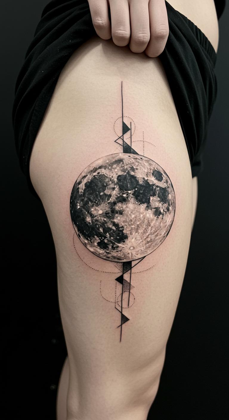 An abstract full moon plays with shapes. Think of overlapping lines in a circle. Thigh allows for creativity. Doodle abstracts on a notebook. Geometric stickers from stores work for testing. Place and remove. Keep it fun: vary the patterns. Try different papers for ideas. Artist rates hit $100. Maintain with lotions. Perfect for unique tastes.
