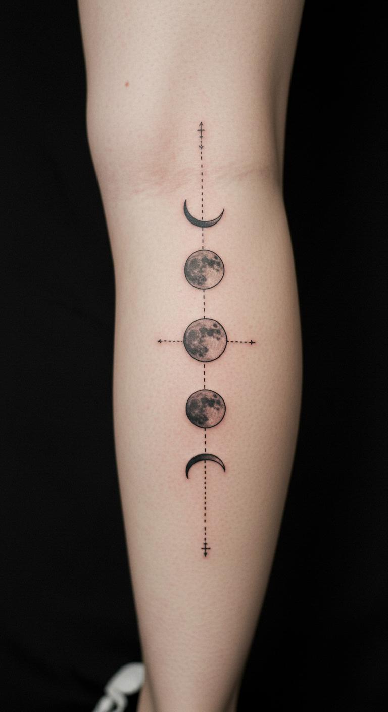 Moon phases show life’s cycles. See them lined up on your leg. This design tells a journey. Plan with a timeline drawing. Phase stickers are easy and affordable. Stick on sequentially. Step: connect the dots mentally. Use a ruler for straight lines. Sessions cost $70. Heal with patience. It’s inspiring for growth.