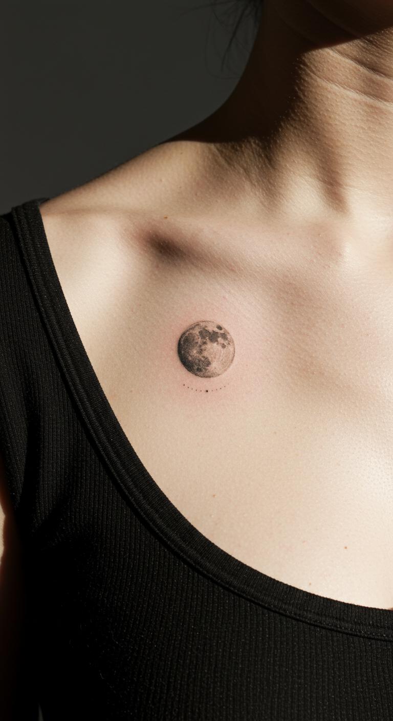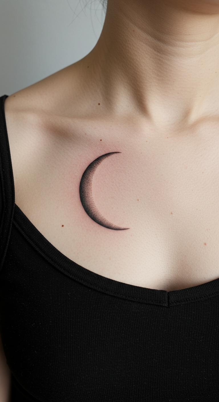 Gradient shading on your collarbone gives a moon depth. Picture lines fading from dark to light in the moon’s form. This area peeks out on special occasions. Test with makeup brushes and eyeshadow at home. Buy affordable shading kits from beauty stores for under $10. Blend colors gently on your skin. Break it into parts: start light and build up. Pick washable shades for easy removal. Artist prices might hit $100. Protect it from sun with clothing. It’s a fresh way to add dimension without complexity.