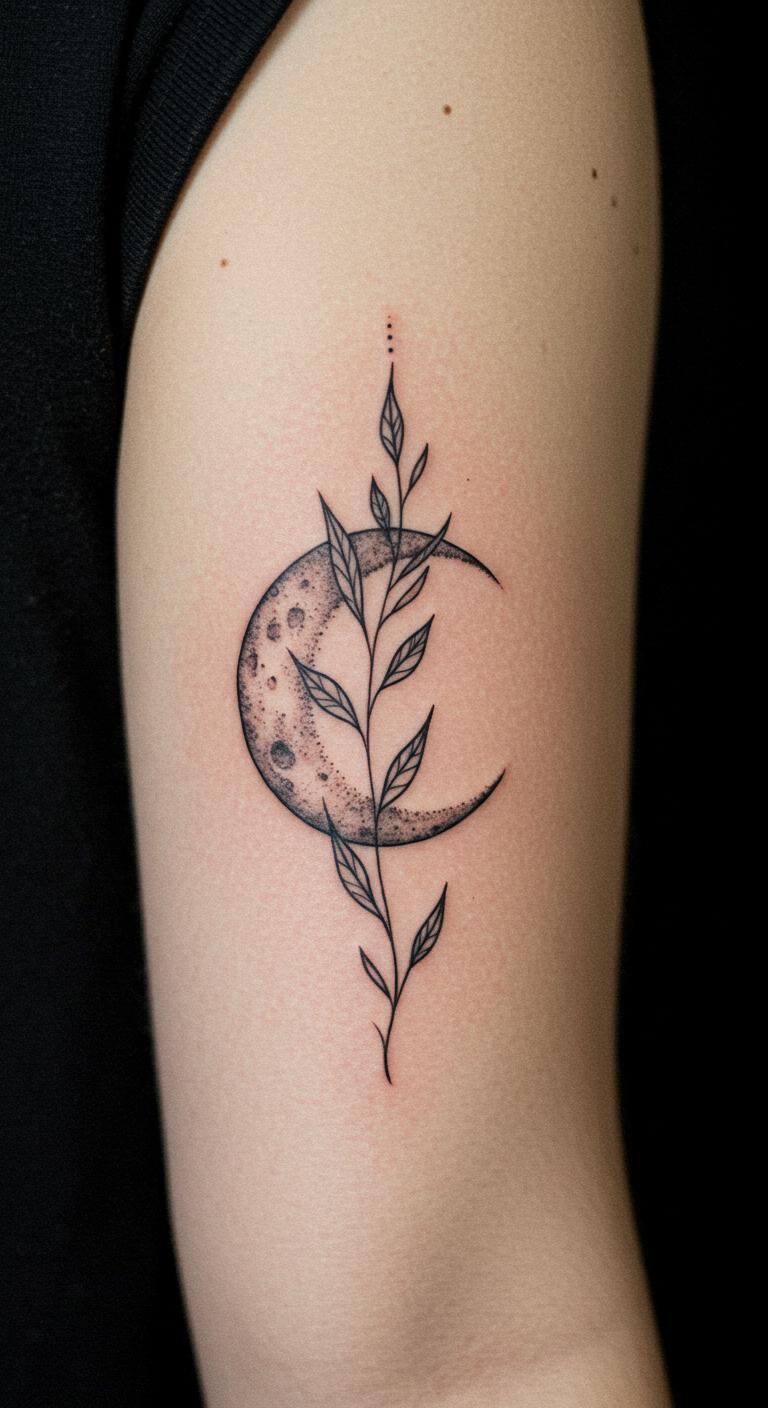 Moon with leaves brings outdoors in. See a moon with vein lines. Arm shows it off. Sketch leaves on paper. Leaf templates are budget buys. Trace and apply. Step: add green accents. Use natural dyes for tests. Ink costs $80. Protect from elements. It’s earthy and cool.