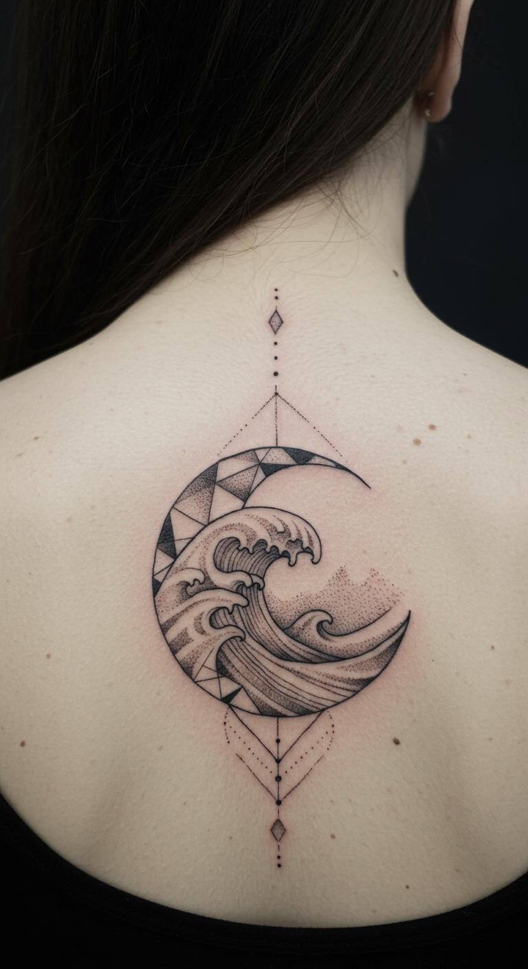 Geometric waves around a moon add edges. Picture triangles framing the shape. Back offers space. Design with graph paper. Wave stencils cost little. Cut and place. Tip: align the angles. Use a compass for accuracy. Sessions are $100. Keep lines sharp. Fun for math lovers.