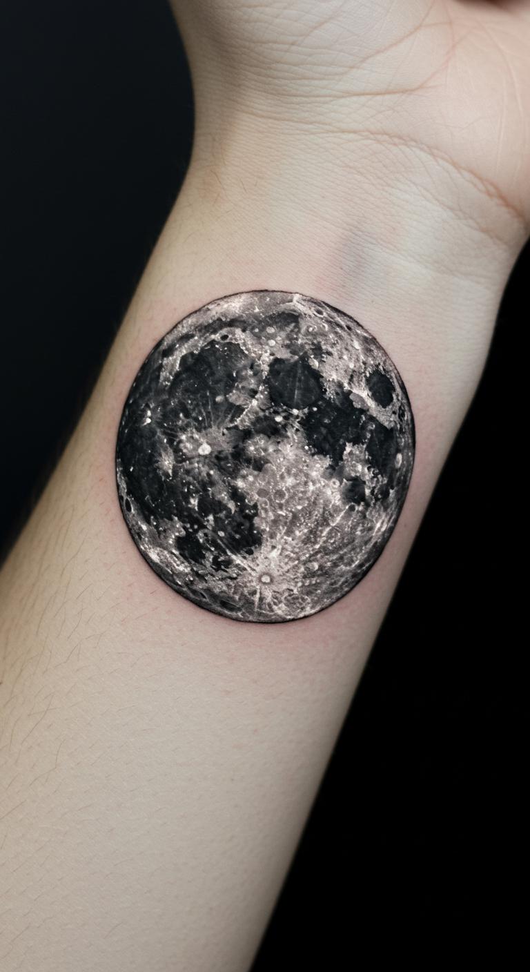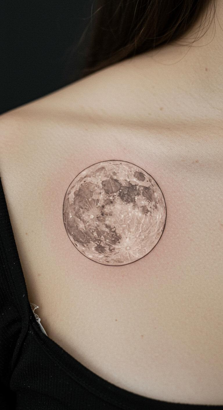 A full moon in fine lines offers clean elegance. Envision a circle with just a single stroke. Place it on your shoulder for easy cover. Practice drawing circles on paper first. For home trials, get tattoo stencils online; they cost less than $5 and transfer easily. Use them with body paint from your kit. Simple steps: clean the area and apply. Opt for hypoallergenic products to avoid irritation. Going to a shop? Expect $60 to $120. Touch up yearly to keep lines sharp. This design suits anyone seeking simplicity. Add a border if you want more detail later.