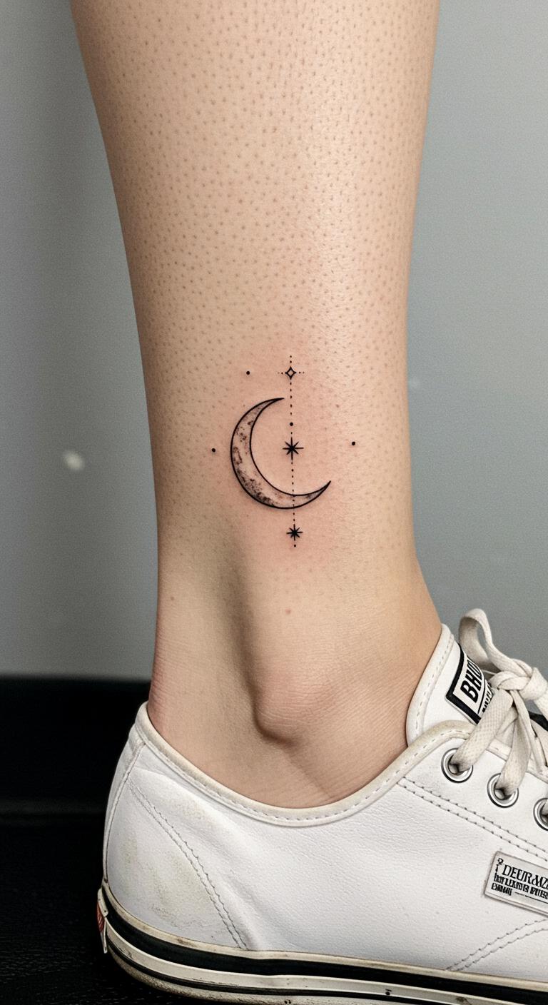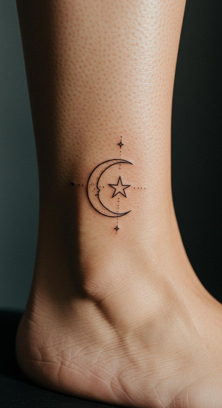 A star beside a moon on your ankle adds a celestial touch. Think of a small dot for the star next to a half-moon line. This spot stays hidden under socks. Sketch it on with eyeliner to see how it looks. Try stick-on versions from craft stores; they’re cheap and reusable. Stick them on in minutes with tape. Keep sentences short: plan for pain in bony areas. Use numbing cream from the pharmacy for comfort. Artist fees could be around $80 for something this size. It heals quickly with daily care like soap and lotion. Make it yours by adding a birthstone color with markers for a test run. Great for subtle daily reminders.