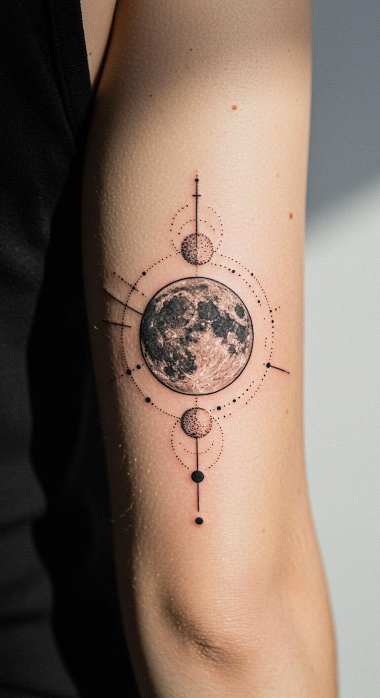Mixed styles make a moon unique. See lines with dots together. Arm displays it. Combine techniques on paper. Mixed stencils are affordable. Layer them on. Advice: blend carefully. Experiment with tools. Ink is $90. Maintain the mix. Adds personality.