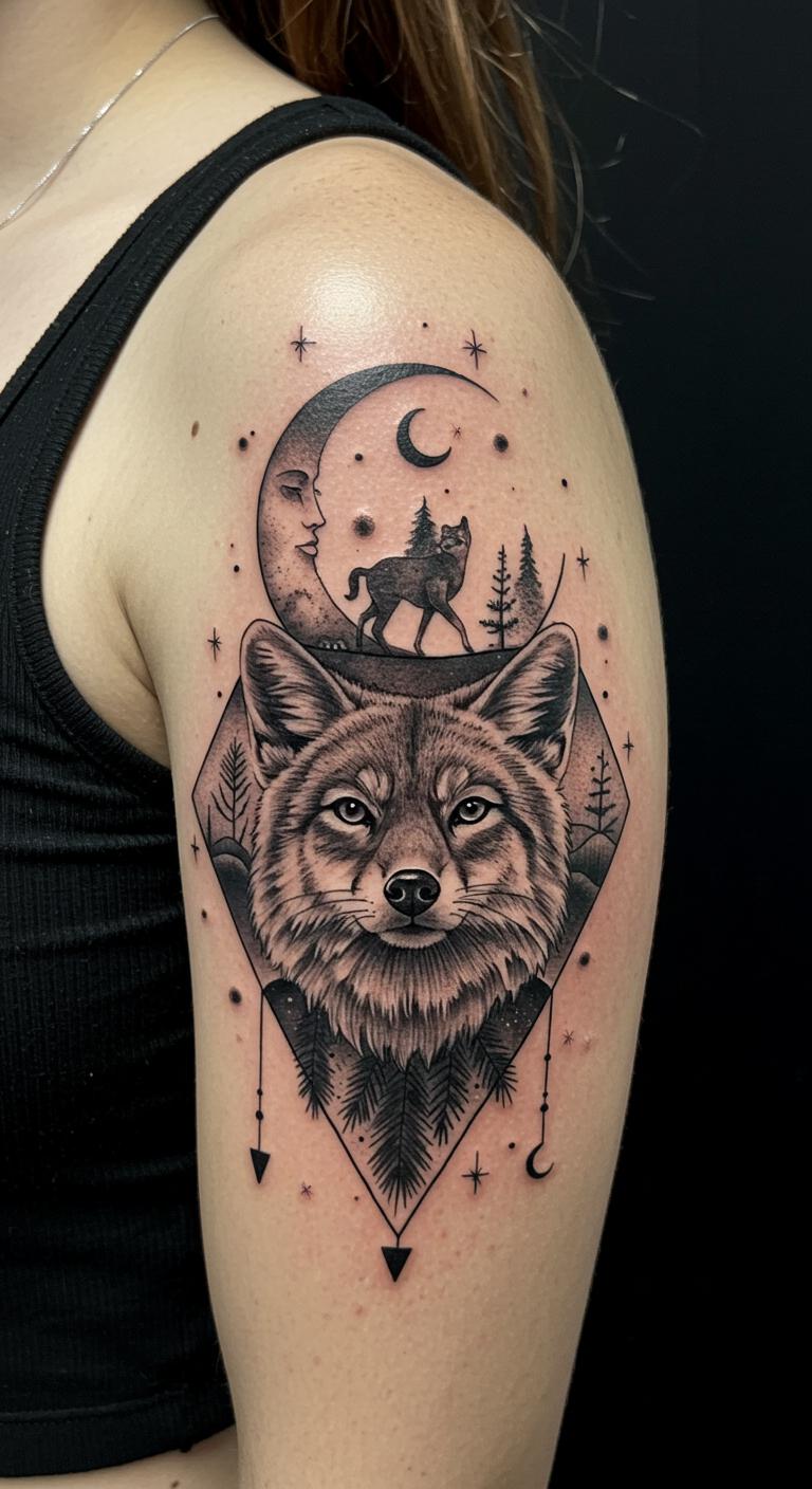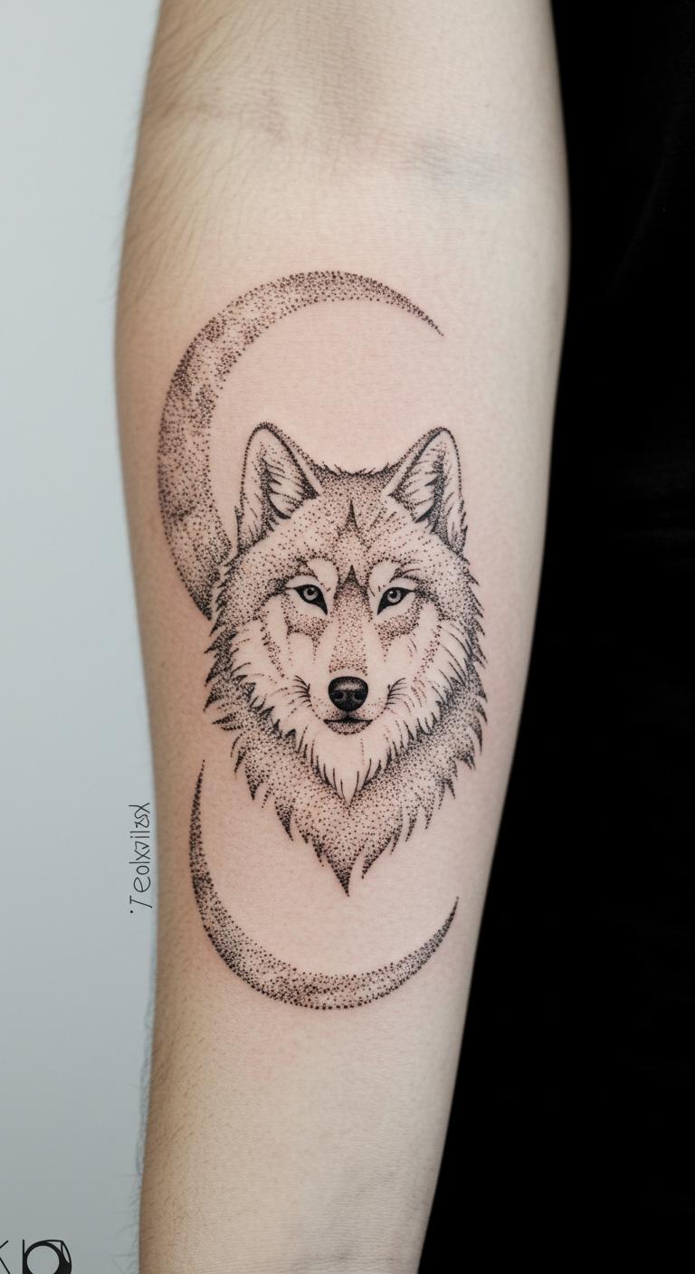 A dotwork wolf under a moon creates texture. See dots forming a wolf’s face with a simple moon above. Put it on your forearm for visibility. Draw dots with a pen to plan. Use dot stickers from kids’ sections; they’re fun and cheap. Apply and peel off as needed. Short advice: space dots evenly. Get dot-making tools like a marker set for $5. Pros charge about $90. Keep it moisturized for longevity. This combo ties into nature themes perfectly.