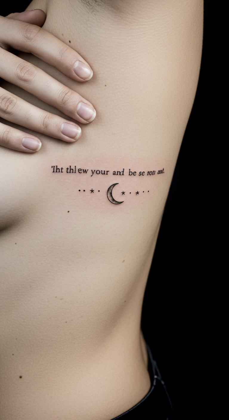 A short quote with a moon adds words to art. Think of a word like “dream” next to a circle. Ribs offer a discreet spot. Write it on with a marker to test. Quote stamps from craft stores are budget-friendly. Press them on your skin temporarily. Simple tip: keep quotes short. Use erasable pens for trials. Ink jobs cost around $100. Protect from rubbing clothes. It serves as a daily motivator.