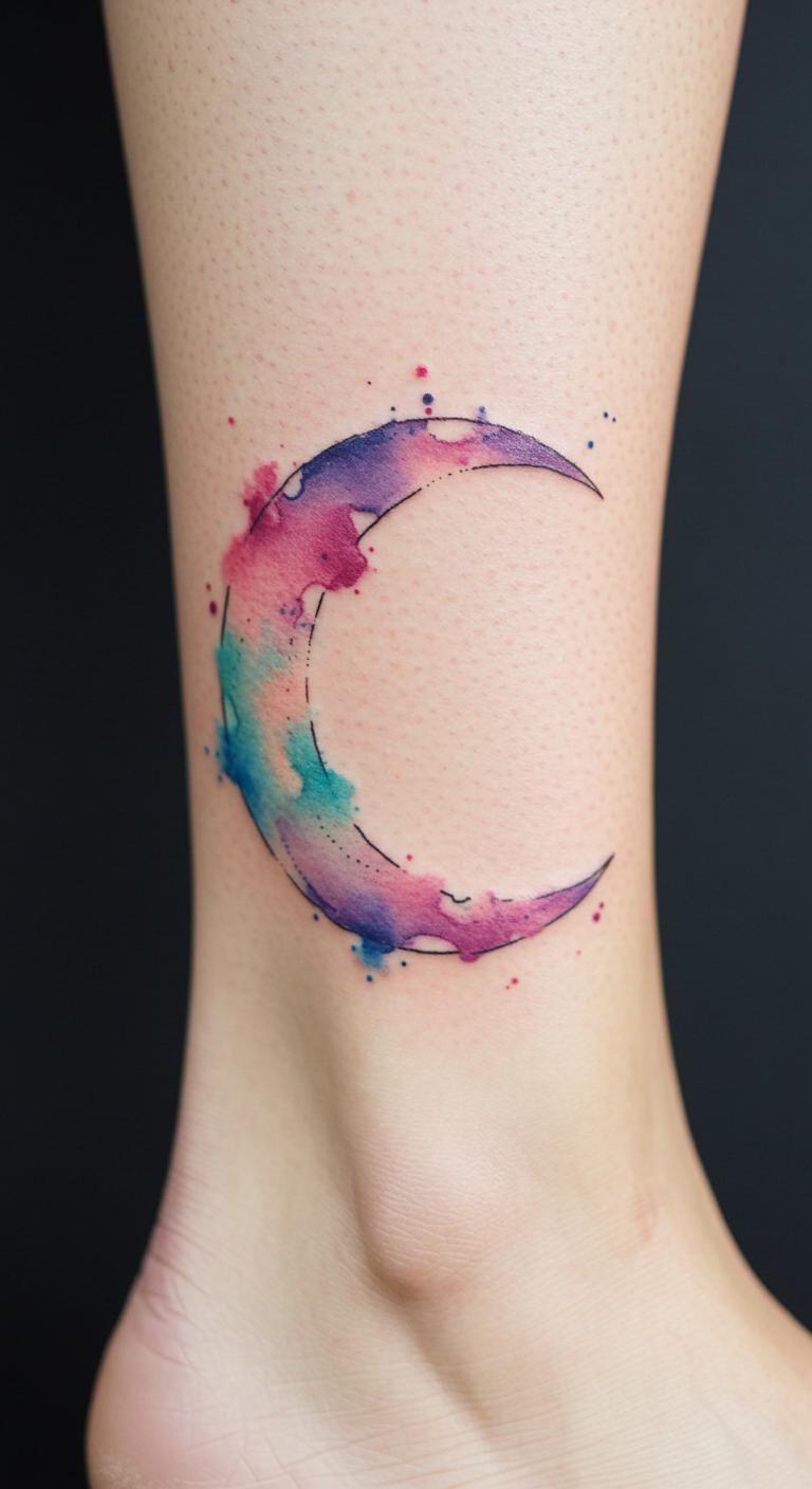 A watercolor crescent brings color softly. See blended hues in a moon shape. Ankle works for this playful design. Experiment with watercolors on paper. Water-based markers from school supplies mimic it cheaply. Draw and wash off. Break down: layer colors lightly. Start with primary colors for mixing. Artists charge $80-$150. Seal with sunscreen. It’s great for artistic vibes.