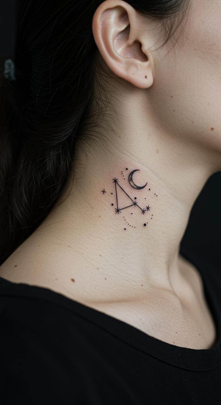 Your zodiac with a moon personalizes it. Picture your sign inside a moon circle. Neck is a bold choice. Draw your sign first on paper. Zodiac temporary tattoos cost pennies. Stick them on and see. Quick step: match your birth chart. Pick symbols that matter to you. Studio fees are about $90. Touch up as needed. It connects to your story.