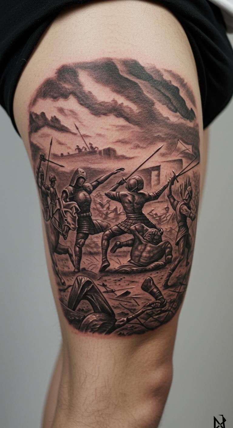 Pick a battle scene snippet on your thigh for epic feels. It shows key fights. Sketch a small fight scene. Use apps to crop images. Free planning tool. Place it for impact. Find action artists online. Use outlines to save money. Break into sessions. Draw it step by step at home. Thrilling for story buffs.