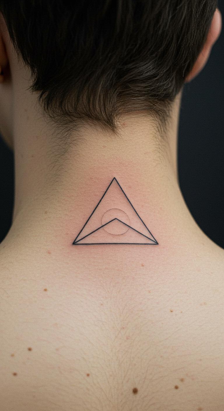 A small triangle on your neck keeps things simple and modern. Pick a design that means something to you, like balance or strength. Draw it out on paper with a pen to test the look. Visit a local tattoo shop for an affordable session, often under $100. Use basic art supplies at home to sketch ideas. Clean the area with soap and water before going in. This shape fits daily wear without drawing too much attention. Add a dot inside for a twist. Keep it small to hide under collars if needed. Healing takes a week or two with gentle care. Try rubbing on lotion daily to keep skin soft. Friends might ask about it, so have a story ready. Go for black ink to save on color costs. Practice drawing triangles on your arm first. This tattoo works for any occasion.