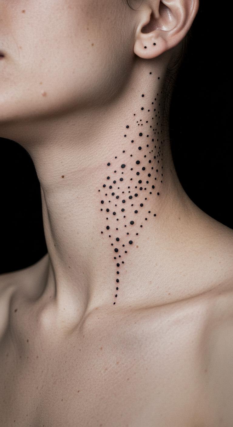 Dot patterns make your neck tattoo feel like art. Opt for a few dots in a row for a clean effect. Draw dots with a marker on your skin to preview. Local shops offer this for less than $80. Grab colored pencils to plan at your desk. Clean the area with alcohol wipes ahead of time. Dots stay hidden under hair if you want discretion. Group them into a shape for meaning. Use a bandage for the first day of healing. Rub on aloe vera from your garden. Practice dotting on paper with a pin. Black dots are easy and cheap. This pattern adds a personal touch to your day.