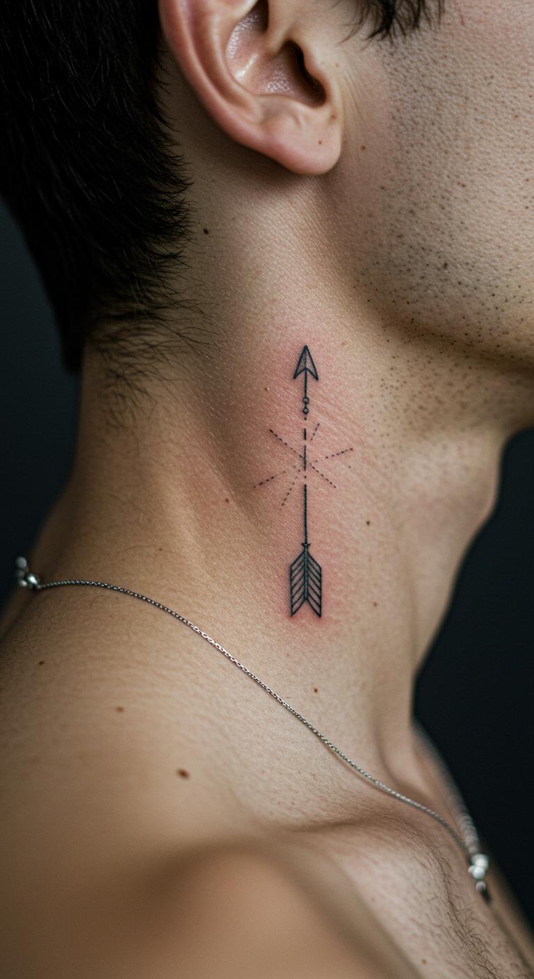 An arrow points to progress on your neck. Select a straight arrow for direction. Sketch it freehand on paper to get it right. Tattoo spots in town do this for about $60. Use online templates to trace at home. Shave the neck area for a smooth base. Arrows work well for motivational vibes. Add a feather end for variety. Cover with clothing during early healing. Apply coconut oil you have in the kitchen. Draw arrows on your hand first. Stick to basic ink to cut expenses. This design fits your active lifestyle.