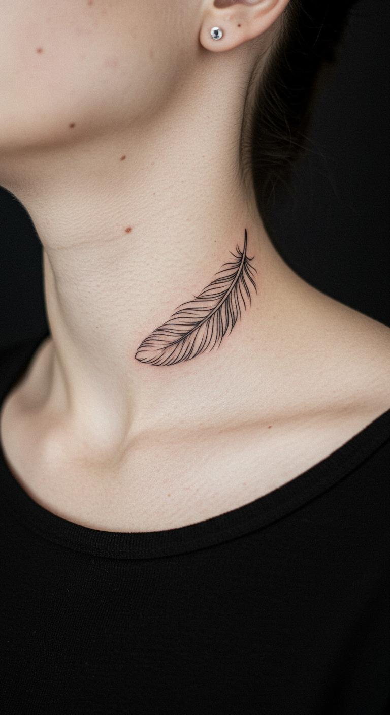 Feather outlines bring a light feel to your neck. Go for a slim feather shape. Trace it on paper with ease. Artists charge around $70 for this. Download free drawing apps to experiment. Wash the spot with mild soap beforehand. Feathers add a soft element to your look. Make it asymmetrical for fun. Heal by keeping it dry for days. Use honey as a natural moisturizer. Practice on fabric scraps. Opt for single-color ink. This tattoo enhances your everyday style.