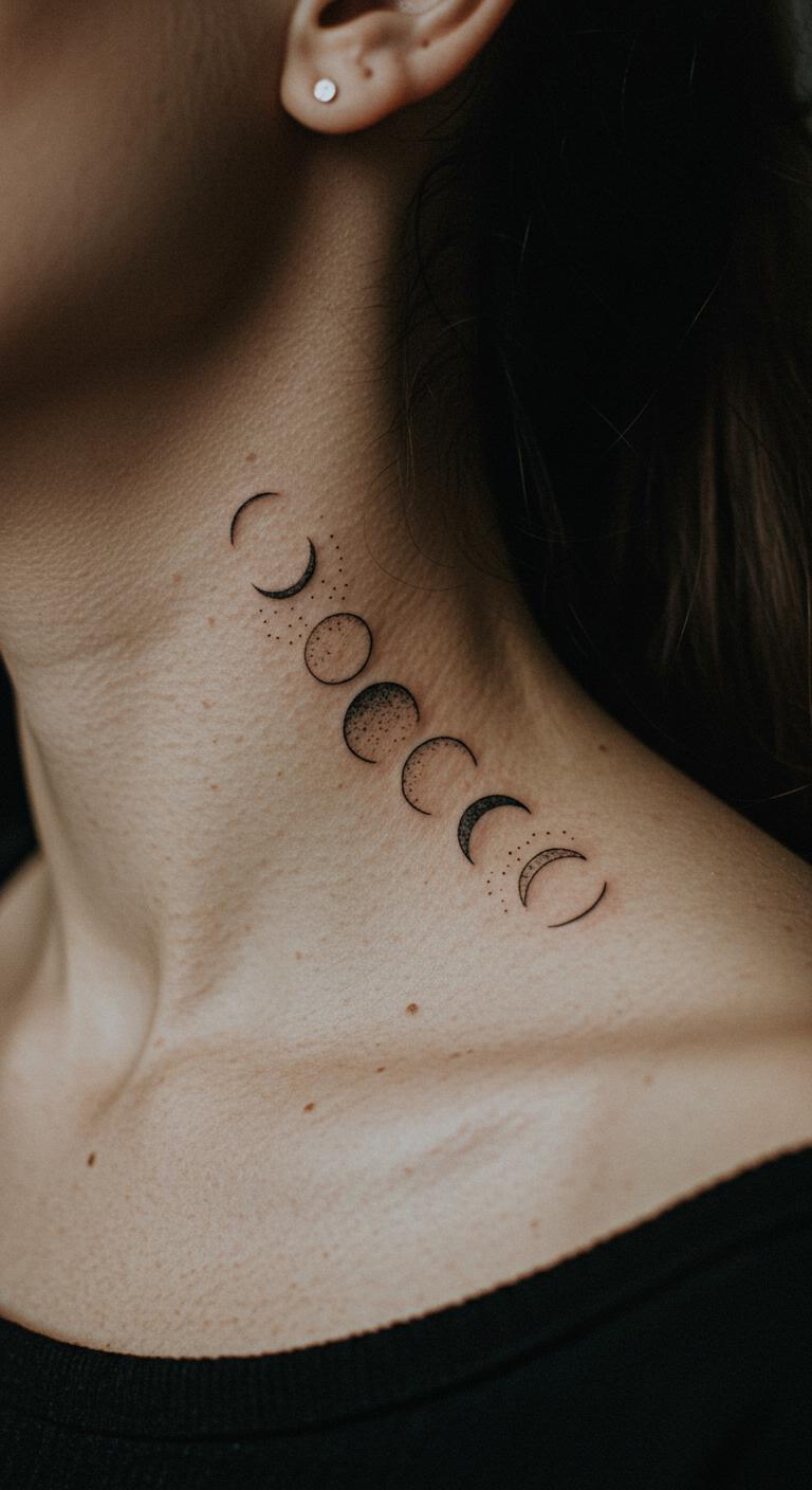 Moon phases track change on your neck. Pick a sequence of crescents. Draw phases on paper quickly. Get it done for under $90 at a studio. Use household items like coins to trace circles. Prep with a gentle scrub. Moons suit night owls or dreamers. Vary the sizes for depth. Protect with sunscreen during healing. Dab on olive oil from your pantry. Sketch on a mirror first. Choose affordable black lines. This design reflects your inner world.