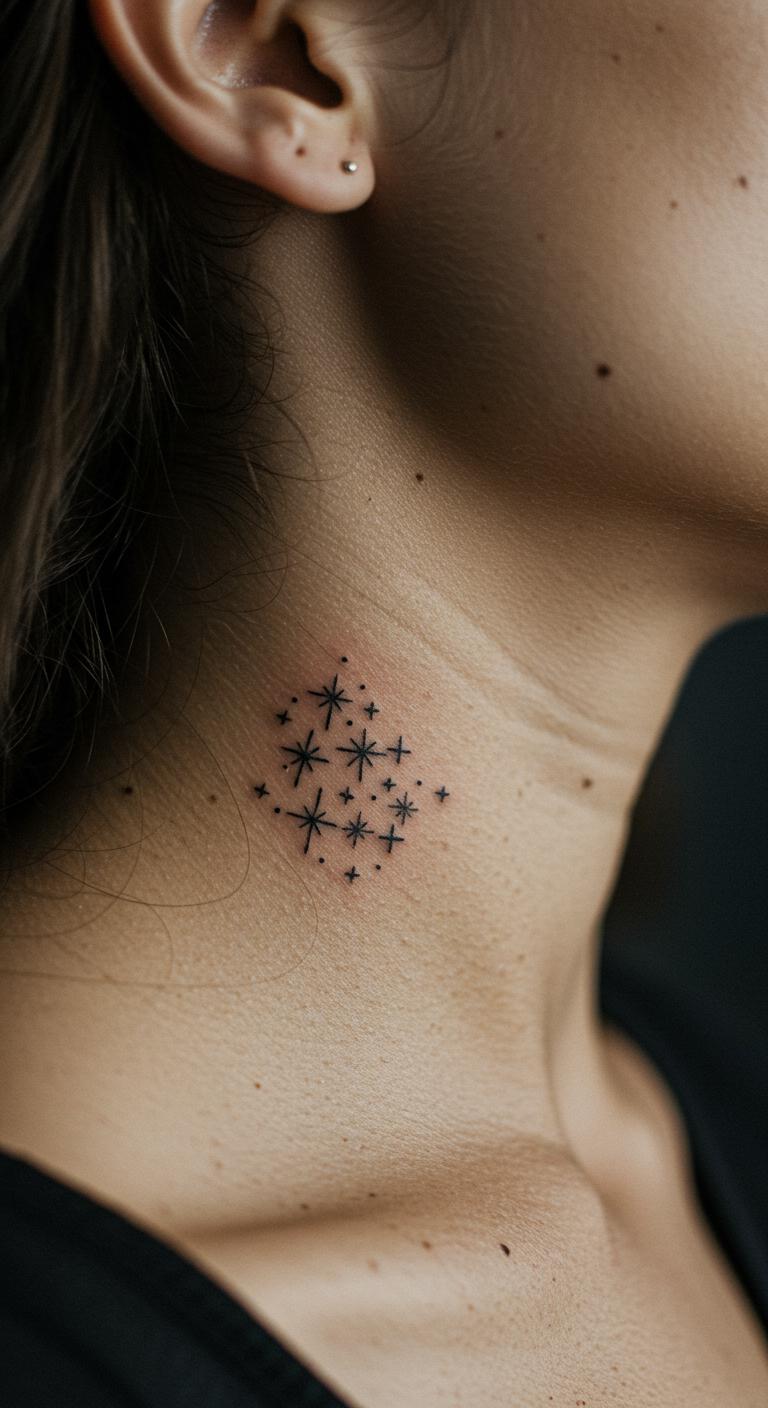 Star clusters sparkle subtly on your neck. Choose a few stars grouped together. Mark them on paper with a pencil. Artists price this at about $65. Use star stickers to plan ahead. Wipe the area clean. Stars represent guidance or wishes. Arrange them in a pattern. Heal with breathable bandages. Apply vitamin E oil from capsules. Draw on your wrist first. Select simple dots. This tattoo lights up your style.