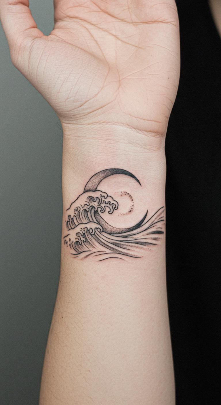 Envision a wave meeting a moon crescent. It blends night and sea. Sketch both on paper. Connect them smoothly. This DIY step makes it unique. Look for affordable artists. Costs about $75. Draw with moon templates. Wear it on your wrist for dreams. Wave moon symbolizes tides. Use coins for circles at home. Refine ideas. Go for weekday deals. Practical and fun.