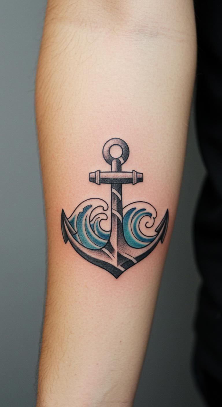 See an anchor wrapped in wave lines. It stands for strength and the sea. Start by doodling an anchor on paper. Add waves around it for flow. This DIY method clarifies your vision. Find artists offering deals online. Prices often start at $90. Practice with erasable pens on your arm. Choose your forearm for visibility. Anchor waves symbolize stability. Download free templates to trace at home. Adjust sizes with a ruler. Go for sessions in the evening to cut costs. Keep it practical like this.