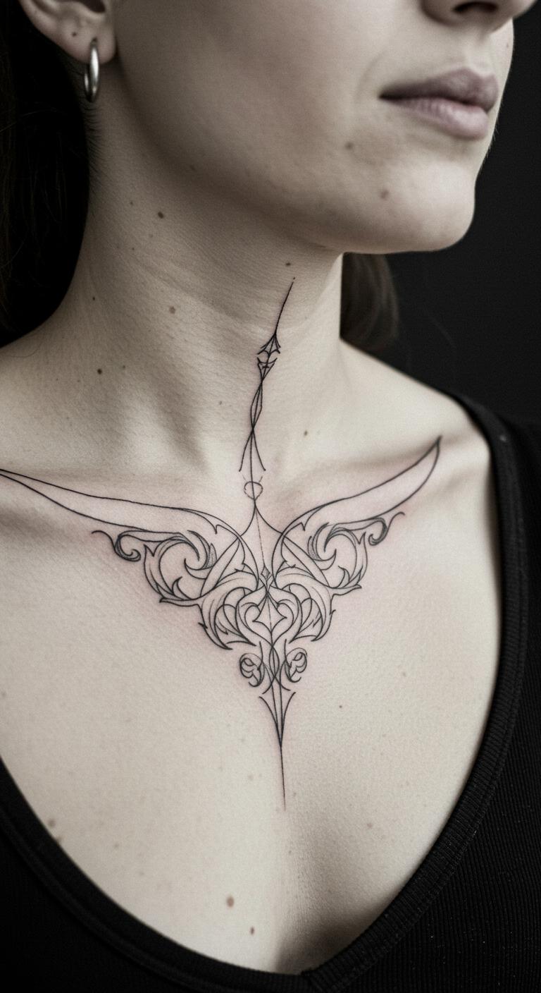 One line with extra details feels artistic. Practice detailed sketches on paper. Use fine tools. Find artists for $70. Test with detailed templates. Put on your collarbone for style. Keep drawings neat. Bold the intricate parts. Opt for convenient times. Add personal details. This design stands out without complexity.