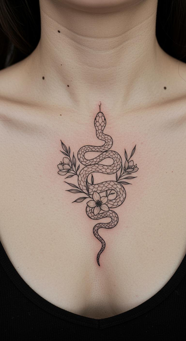 Embellish with flowers for grace. Put it on your collarbone. It softens the snake’s edge. Draw flowers around the snake. Free floral apps help. Artists blend elements cheaply at $70. Practice with flower stamps. Stamp and adjust. Keep flowers small and simple. Your collarbone gains elegance. Hide under collars if wanted. This idea adds beauty to strength.