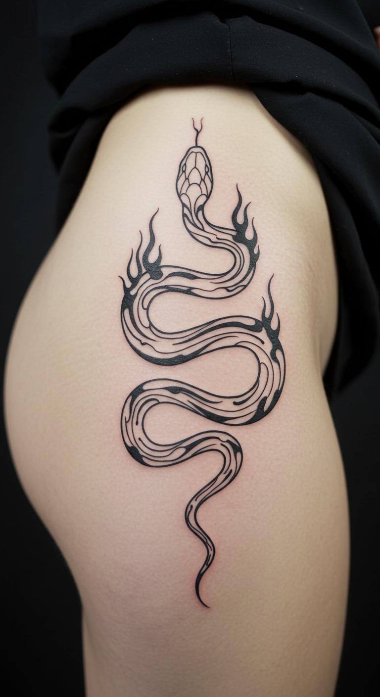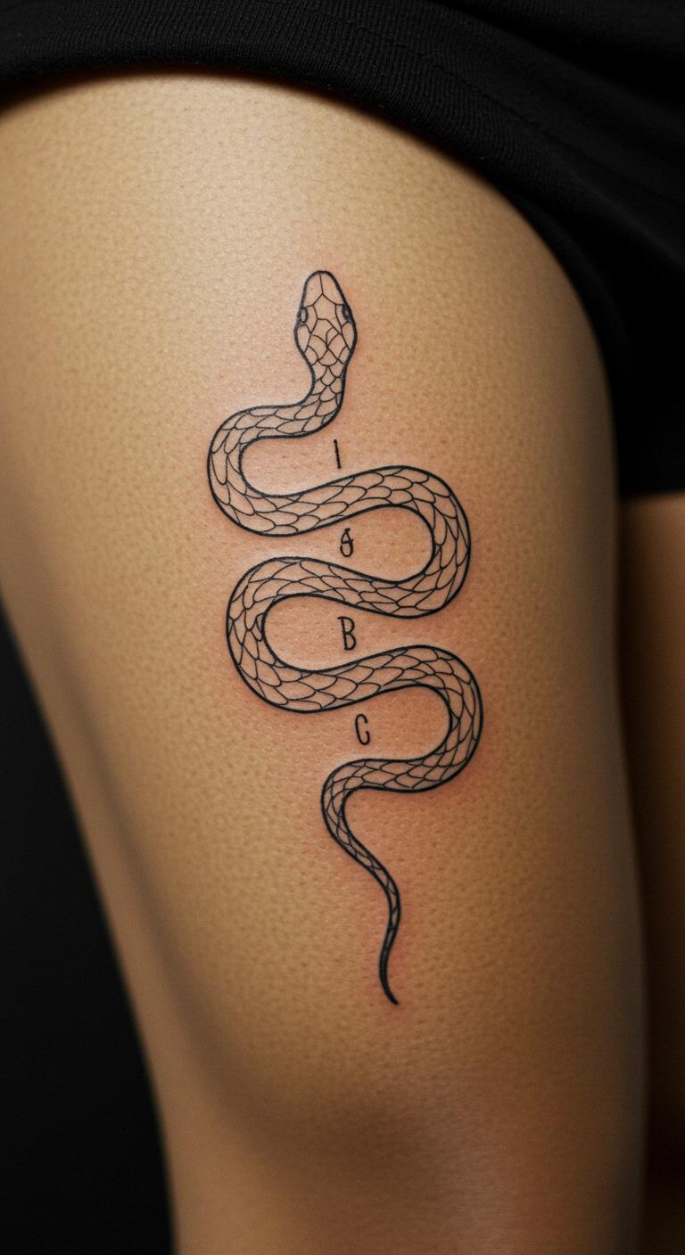 Add family initials to personalize. Put it on your thigh for meaning. Draw the snake with letters. Free monogram generators assist. Artists customize affordably at $80. Try initial stickers first. Place and tweak. Keep it intimate and clear. Your thigh becomes a family tie. Wear shorts to share it. This idea deepens connections.