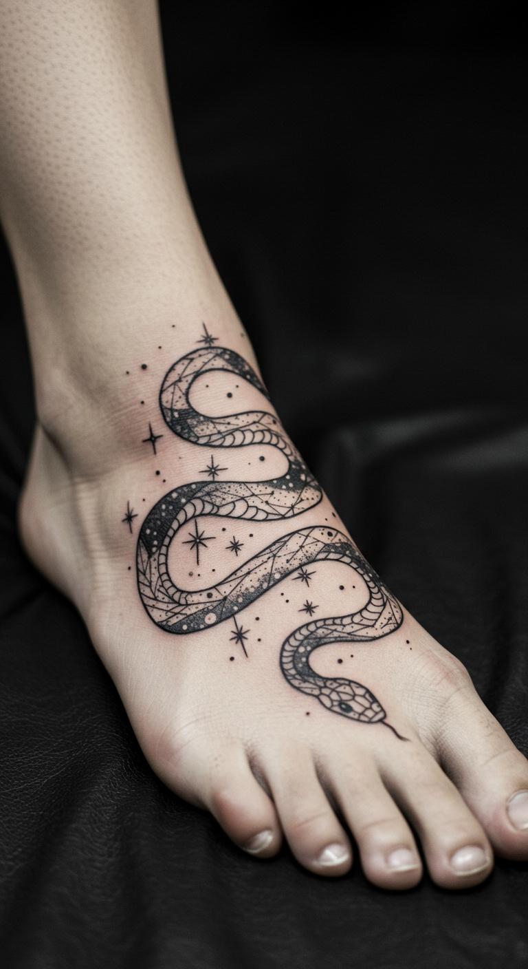 Add stars for a galactic twist. Place it on your foot for adventure. Draw stars along the snake. Free space apps inspire. Artists do patterns cheaply at $65. Use star stickers to plan. Stick and refine. Keep it starry and simple. Your foot explores new worlds. Slip into shoes to hide. This idea sparks imagination.