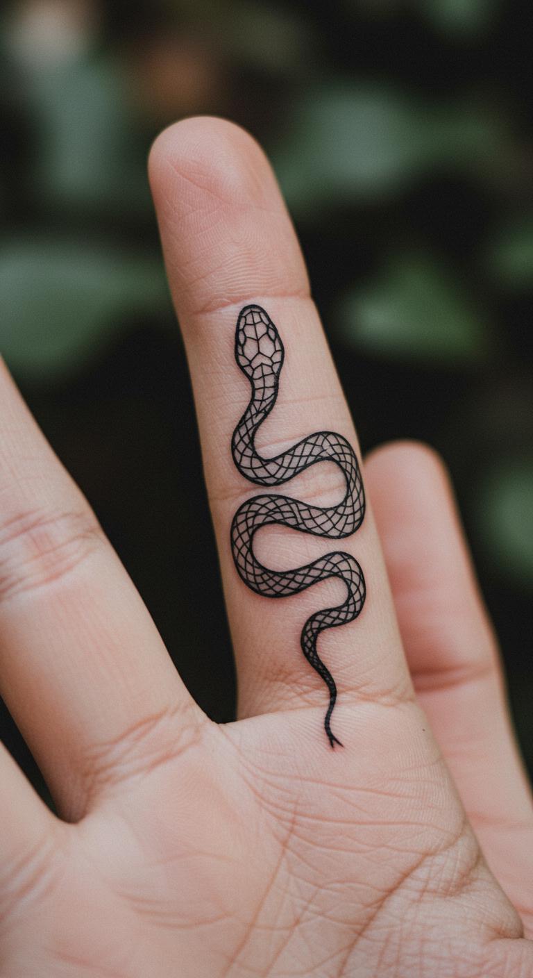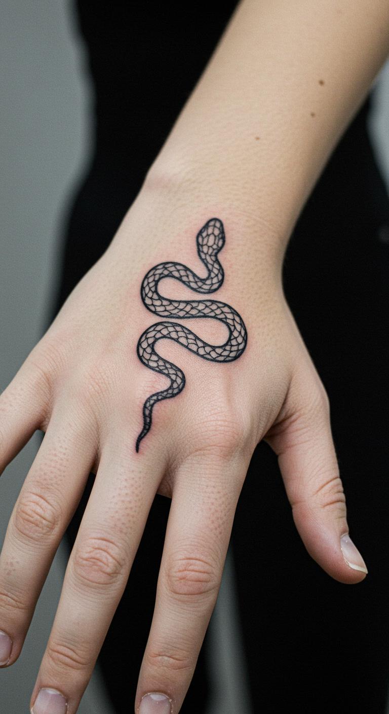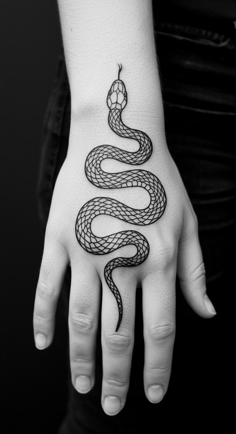 Stick to black and white for timeless appeal. A monochromatic snake fits anywhere. Try your hand for visibility. Grab a black pen and sketch ideas. Keep it to basic lines. Free websites offer templates. Download and tweak them. Find budget artists online. Sessions for simple designs cost about $60. Use temporary ink at home first. Apply and wash off to check. Add a small loop for interest. Your hand becomes a statement piece. Hide it with gloves if wanted. This style lasts without fading fast. Focus on the flow of the snake.