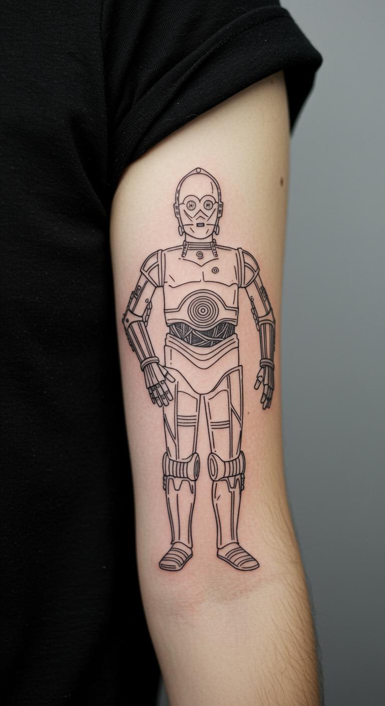 Add C-3PO to your arm. It stands tall in lines. Easy forms save money. Sketch it simply. Try wash-off versions. Seek affordable spots. Place it visibly. Use templates first. This design protocols style.