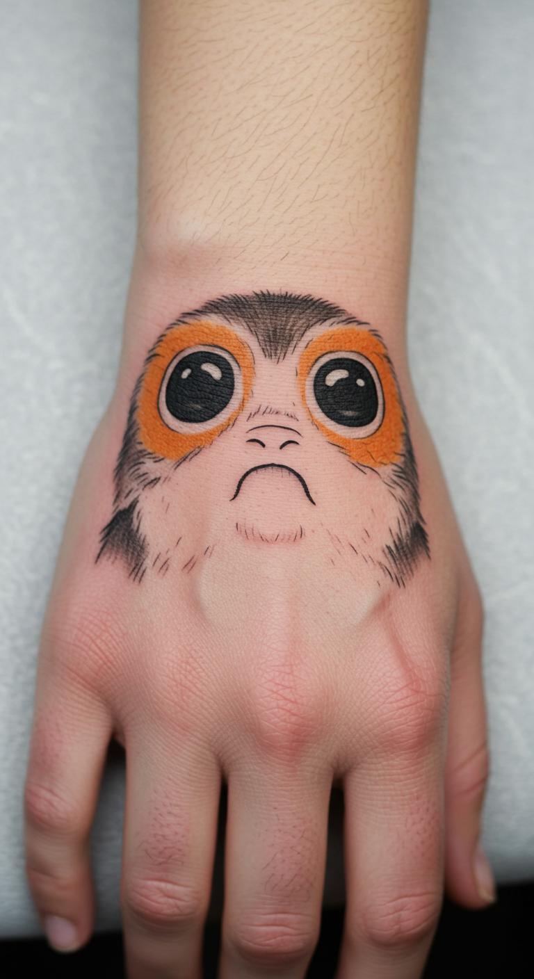 Go for a Porg on your hand. It perches cutely. Few details mean low cost. Practice drawing eyes. Use temporary stickers. Find artist specials. Fit it playfully. Test with paint. This design adds charm.