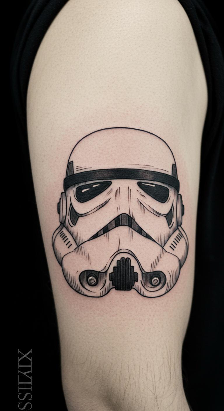 Opt for a Stormtrooper helmet on your bicep. It adds fun with just outlines. Sessions stay short and affordable. Practice drawing it with a basic pen. Use at-home tattoo pens for safe tests. Search local shops for deal days. Keep designs small for less pain. Snap photos to check visibility. This idea pops at events without much fuss.