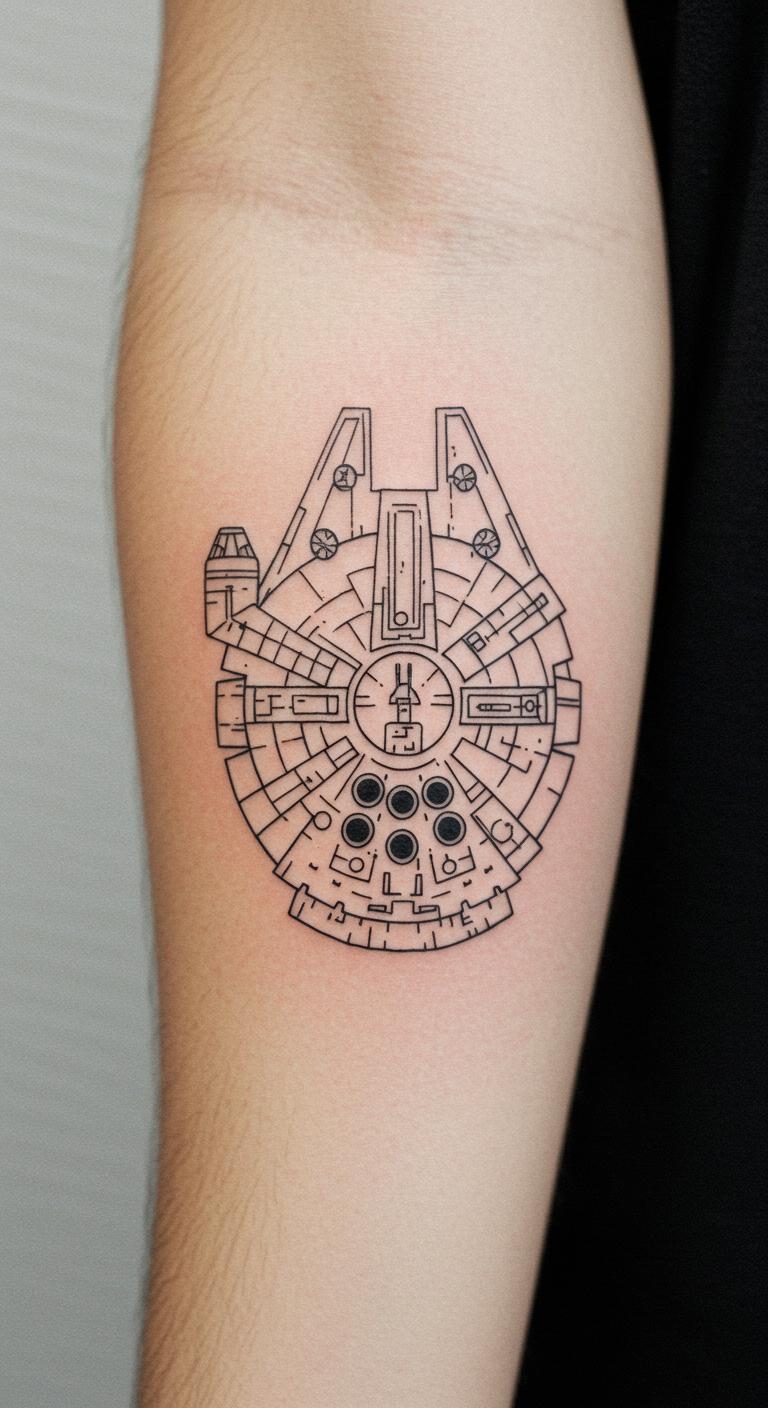 Place a Millennium Falcon sketch on your back. It flies across your skin with ease. Minimal details cut down on time. Start with a freehand drawing at home. Try wash-off tattoos from online deals. Find artists who offer package rates. Position it for personal meaning. Use mirrors to visualize first. This design travels well with you.