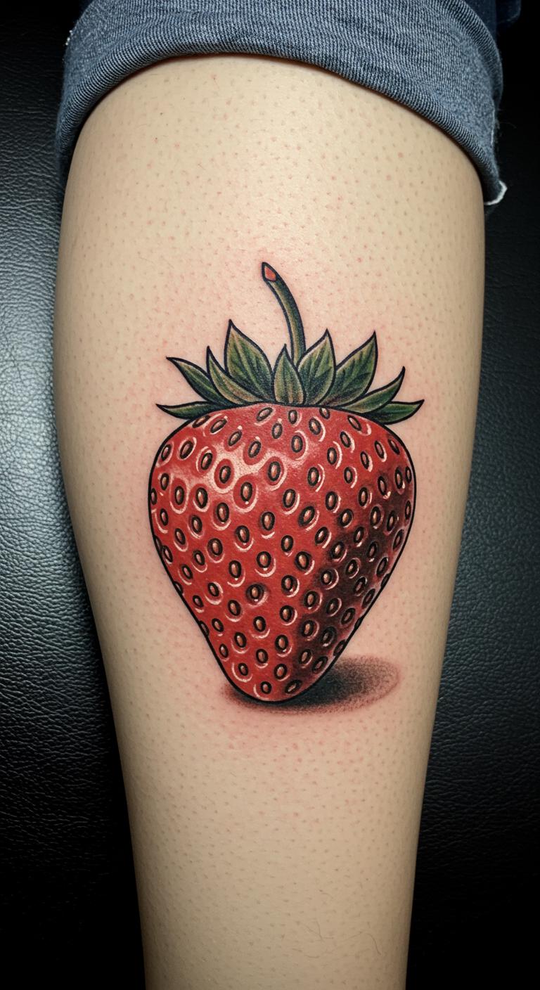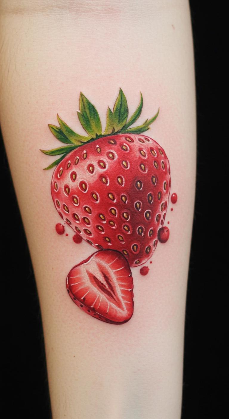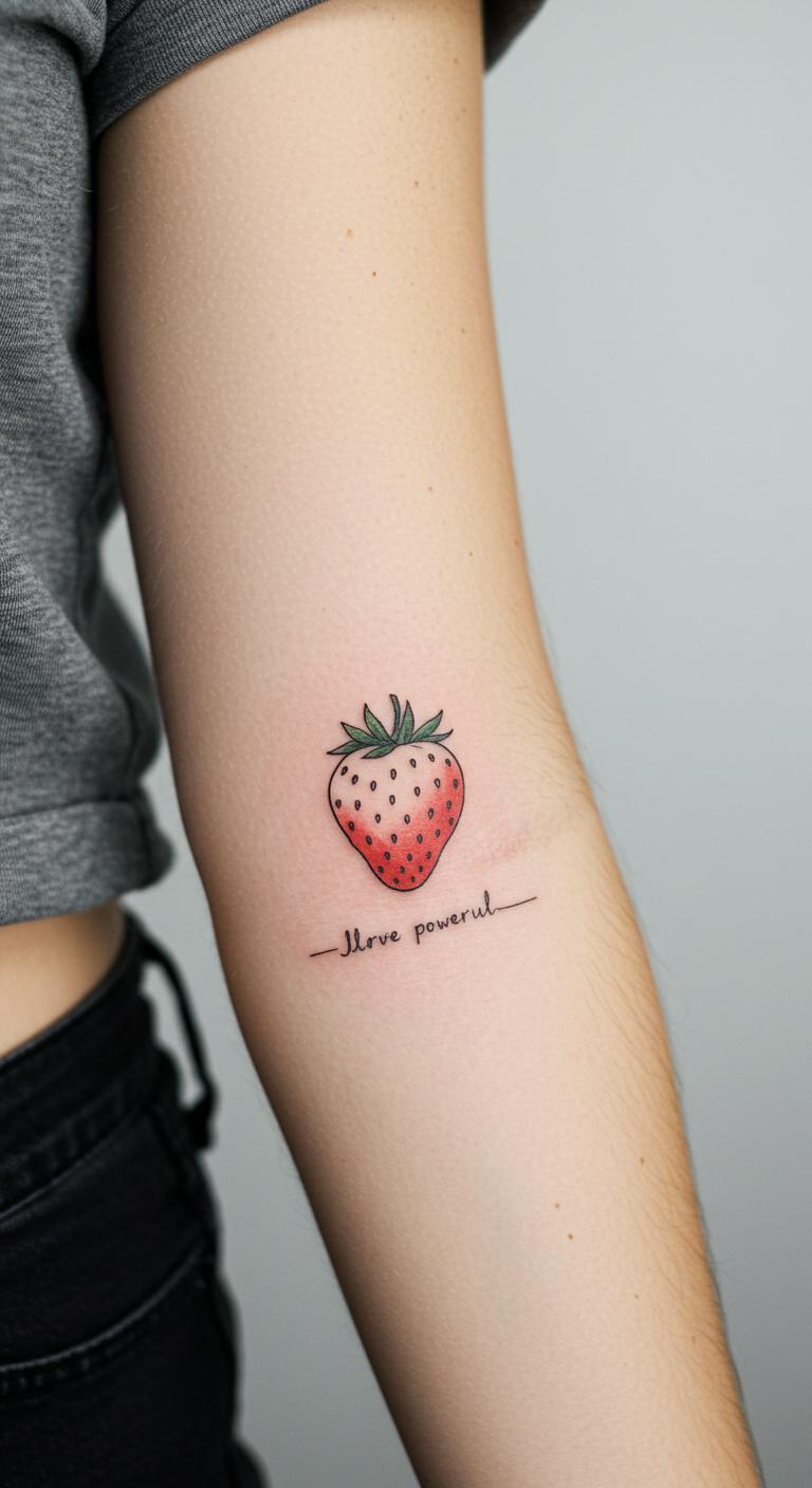 Pairing a simple strawberry with leaves adds dimension to the design. This combination can symbolize growth and vitality, perfect for those who appreciate nature. The leaves can be done in light green or even in simple outlines, allowing for an understated look. This idea is budget-friendly, as artists often charge less for smaller designs. Before committing, sketch your design. Consider how the colors will complement your skin tone.