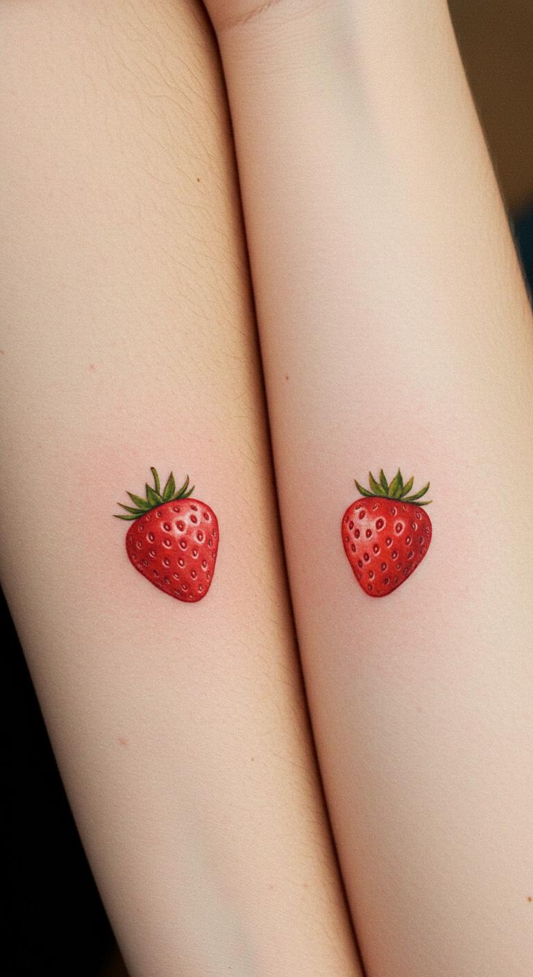 Matching strawberry tattoos with friends capture shared memories. These tattoos reflect bonds and life’s sweetness. Choose a simple design for a more subtle approach or add personal elements like initials or meaningful dates. This idea is often cost-effective, as small tattoos usually cost less. You can explore similar styles but with different placements, allowing each individual a voice while still feeling connected.