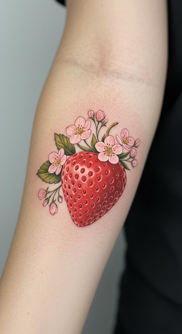 Incorporating flowers with a strawberry creates a vibrant design, symbolizing femininity and beauty. The flowers can be done in varying colors or kept to a minimal palette. This fusion offers texture and visual interest. Consider your favorite flowers; this can make the design more personal. Costs will vary depending on design complexity. Work closely with the tattoo artist to achieve the right balance.