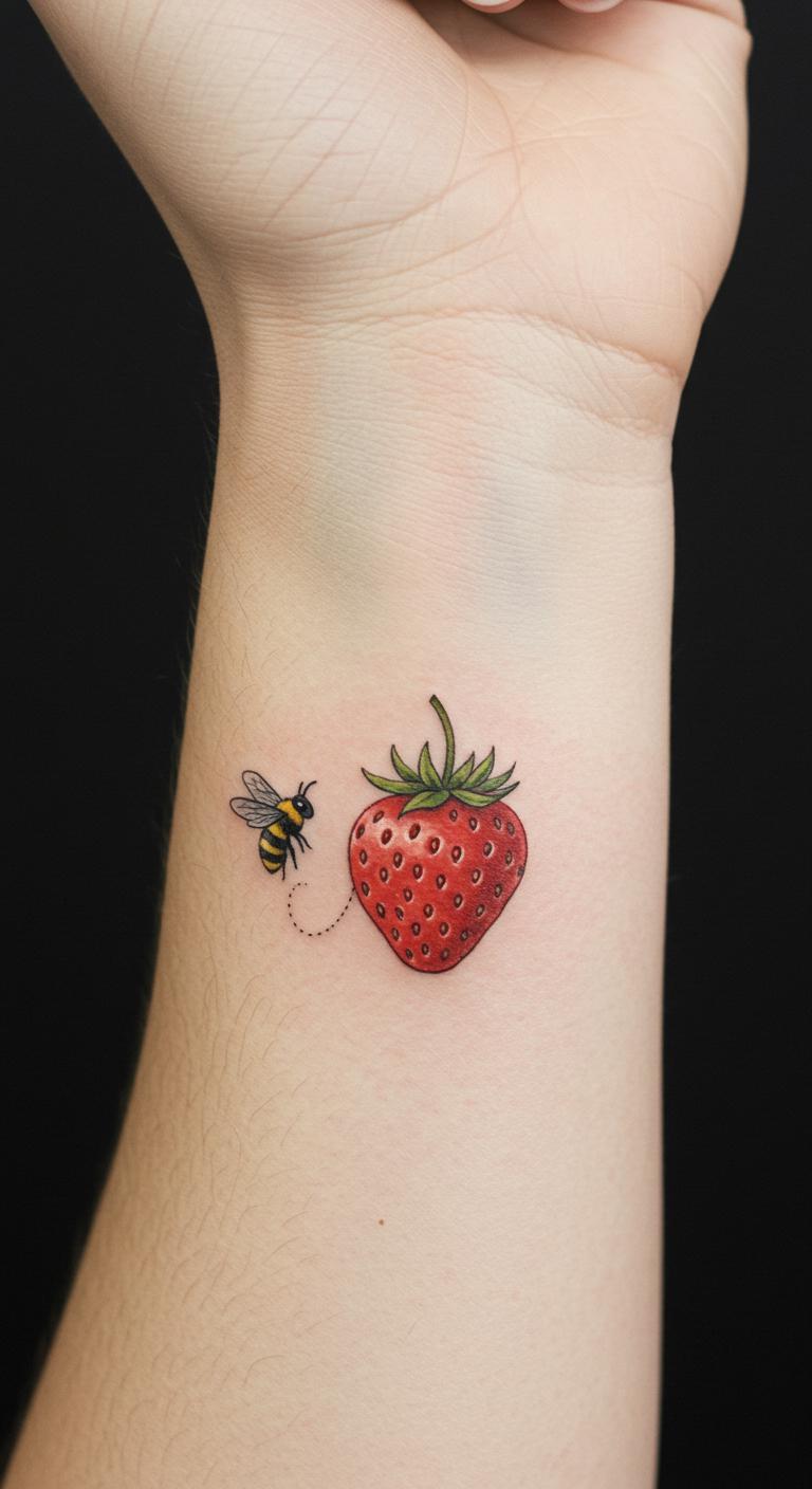 A strawberry mingling with a bee is a symbol of nature and life. The bee signifies hard work and dedication, adding depth to the design. This composition offers a story behind the ink, perfect for those who value aesthetics with meaning. Choose simple, minimal outlines to keep it chic. This design can be done at various price points, depending on the shop and artist.