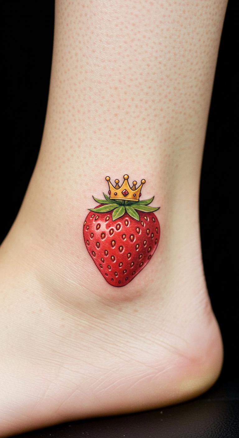 A strawberry with a crown symbolizes purity and royalty. It’s a playful design choice that stands out while keeping the aesthetic chic. This tattoo can be small yet impactful, perfect for a personal tattoo with a twist. Consider adding initials or hearts for more personalization. This design is often budget-friendly, as it can be done in a simple outline or as a colorful piece.