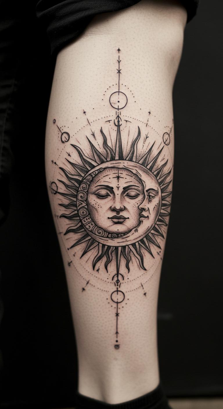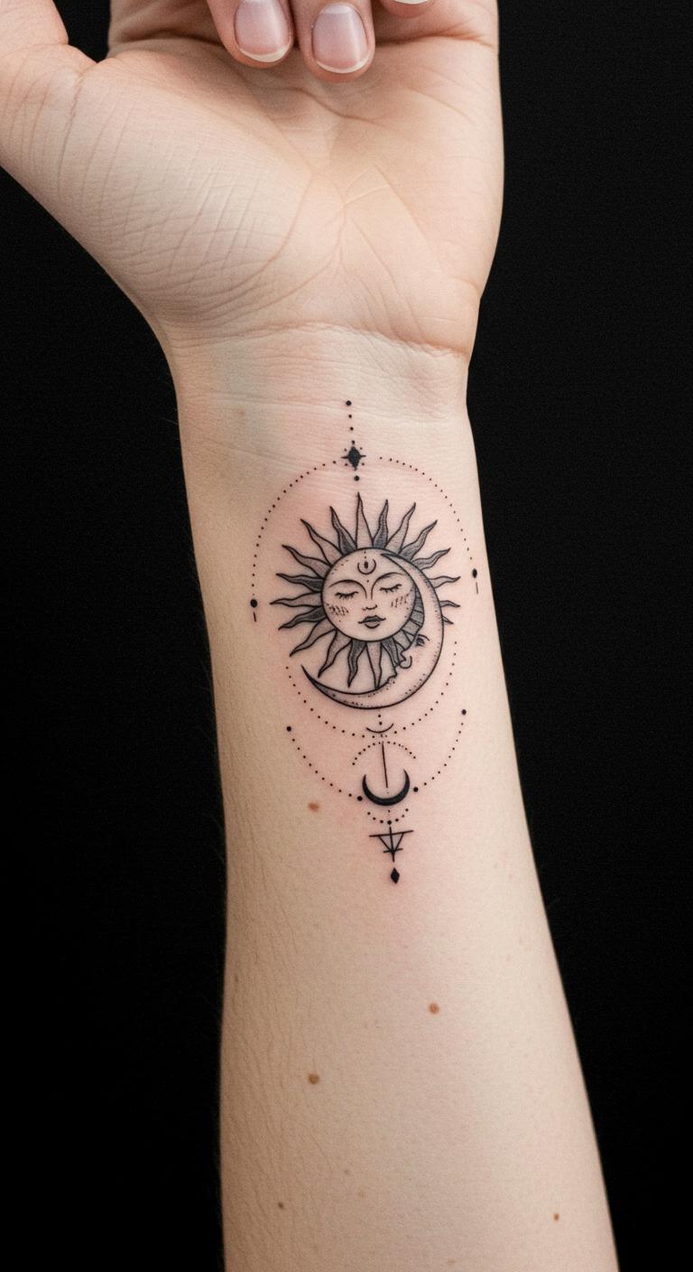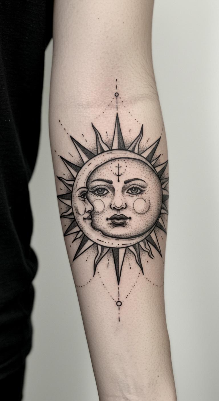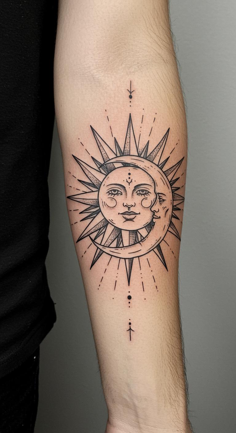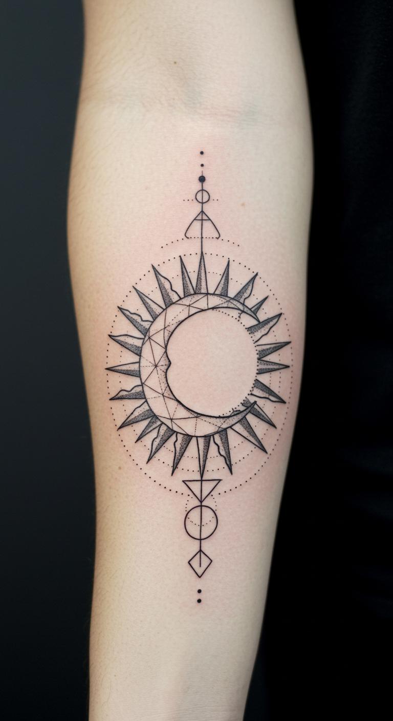 Create symmetry with geometric shapes around your sun and moon. Go for your forearm to show off the modern edge. Use triangles and circles to link the symbols. Draw grids on paper with a ruler from your drawer. Build shapes step by step at your table. Check local fairs for geometric artists; they might have affordable rates. Cover it with sleeves from your closet during healing. Bold this tip: use a ruler at home. It makes planning easy and cheap.