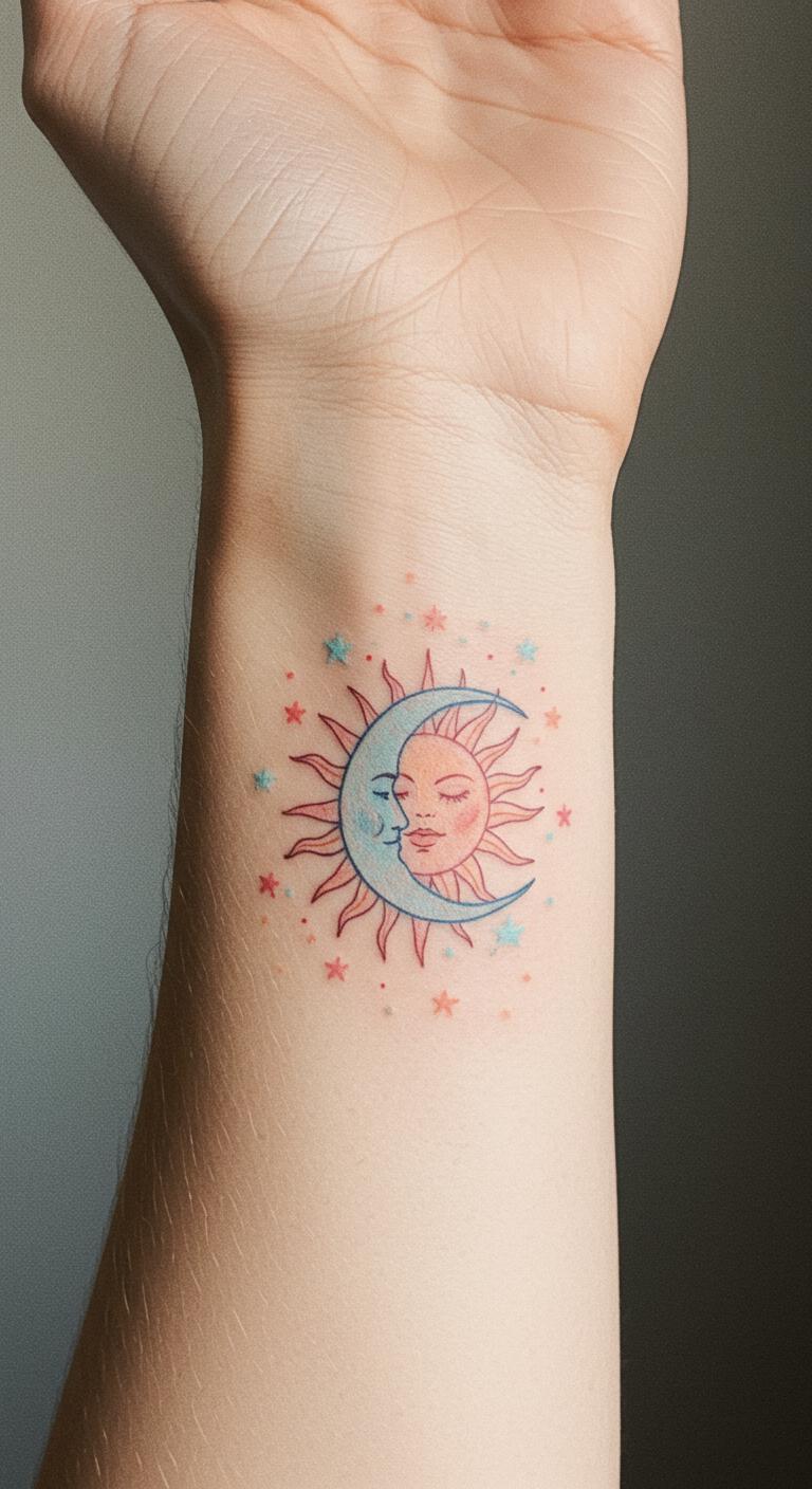 Use pastels for a gentle sun and moon. Try your wrist for subtlety. Mix colors like soft blue. Test with crayons on paper. Blend at home easily. Look for color artists at events. Heal with basic supplies. Bold this: test with crayons. It keeps things simple.