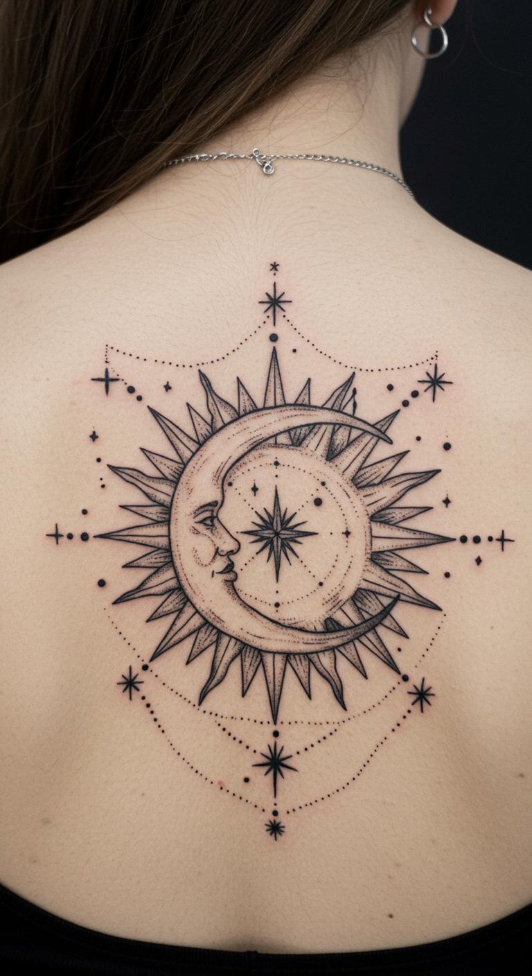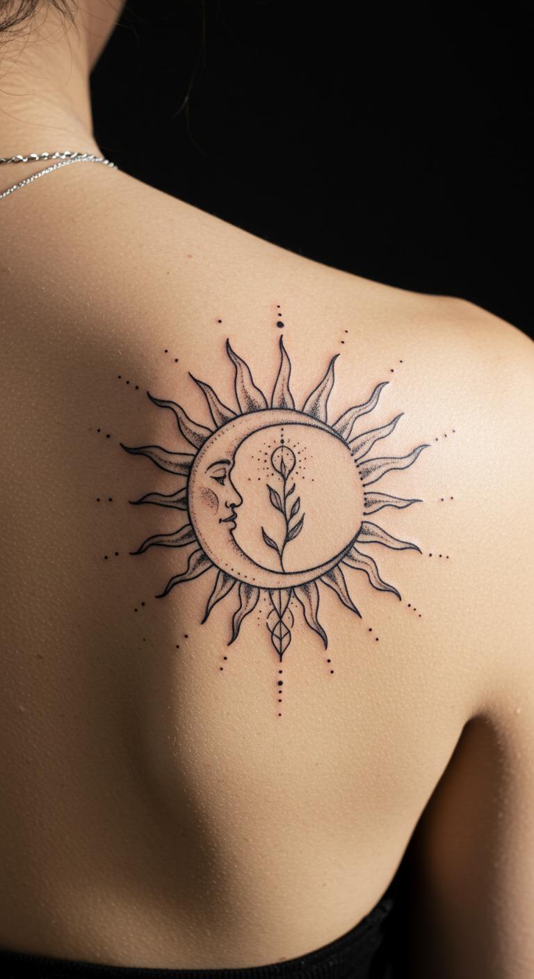 Go big with a mandala that weaves sun and moon into one design. Place it on your back for a sense of wholeness and protection. Use repeating patterns around the sun and moon to show life’s cycles. Draw a basic version on paper at your desk. Add colors with colored pencils if you want vibrancy. Find an affordable artist online who specializes in mandalas. They might offer packages for larger pieces. Prep your skin by staying hydrated. This area heals well under loose shirts. Bold this tip: start with a home drawing. It lets you tweak ideas before ink.