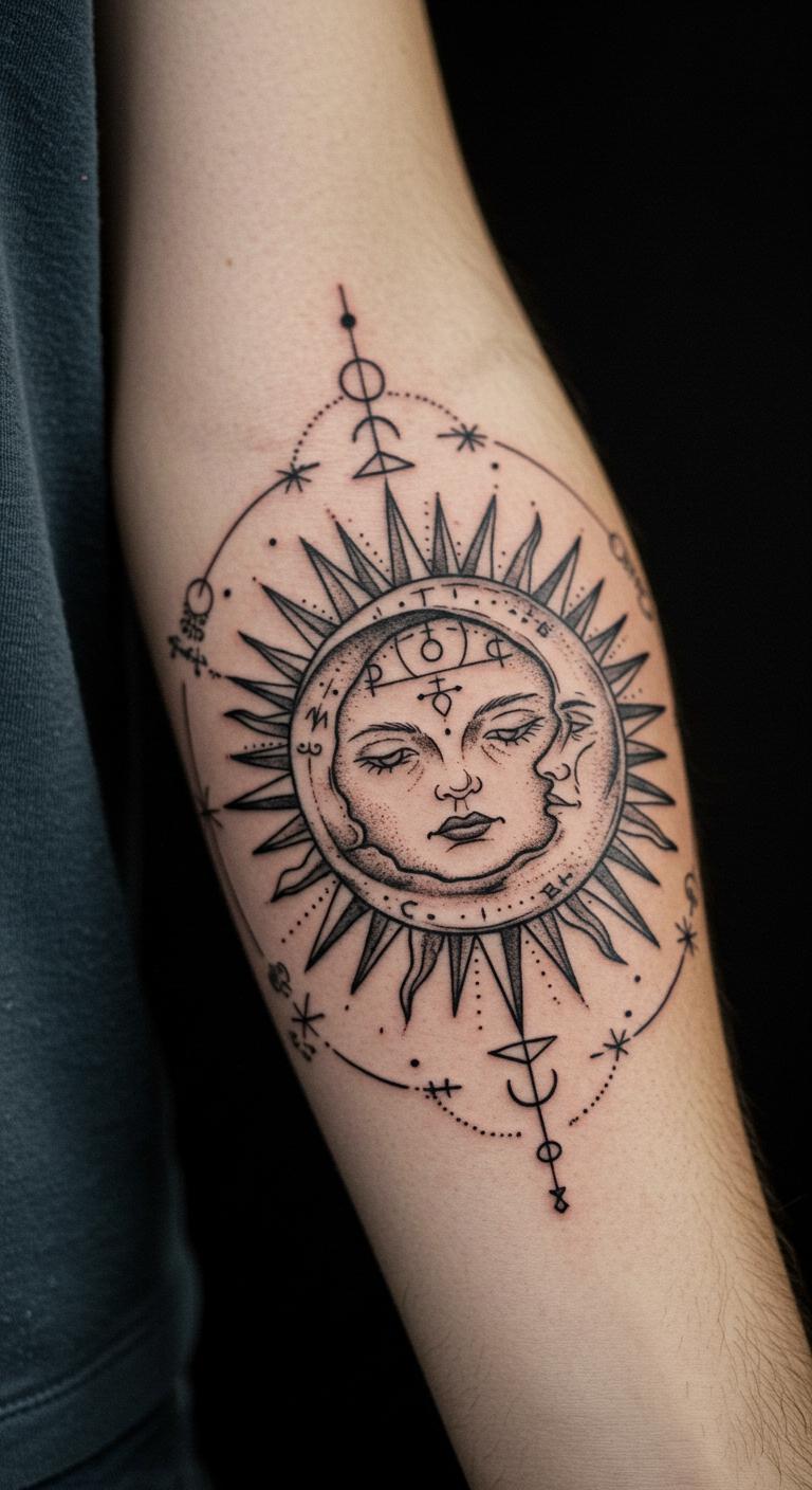 Draw from alchemy for deeper meaning in your sun and moon. Place on your forearm for visibility. Use symbolic shapes. Research and sketch on paper. Adapt with markers. Seek alchemical artists locally. Use books for inspiration. Bold this: sketch symbols on paper. It deepens your connection.
