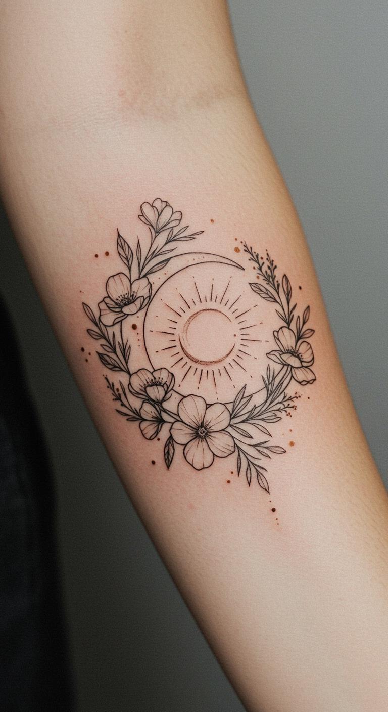 Add flowers to your sun and moon for a soft, natural vibe. Put this on your arm to highlight the feminine energy of growth. Include vines or leaves that wrap around the symbols. Practice by pressing real flowers in a book and sketching them next to your design. Use free apps on your phone to combine elements digitally. Look for artists who do floral work at budget studios. They often have sales for smaller additions. Keep the area clean with basic lotion from your cabinet. Bold the advice: use app tools at home. It saves time and cash.