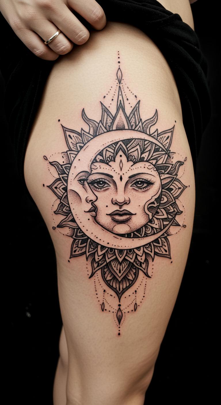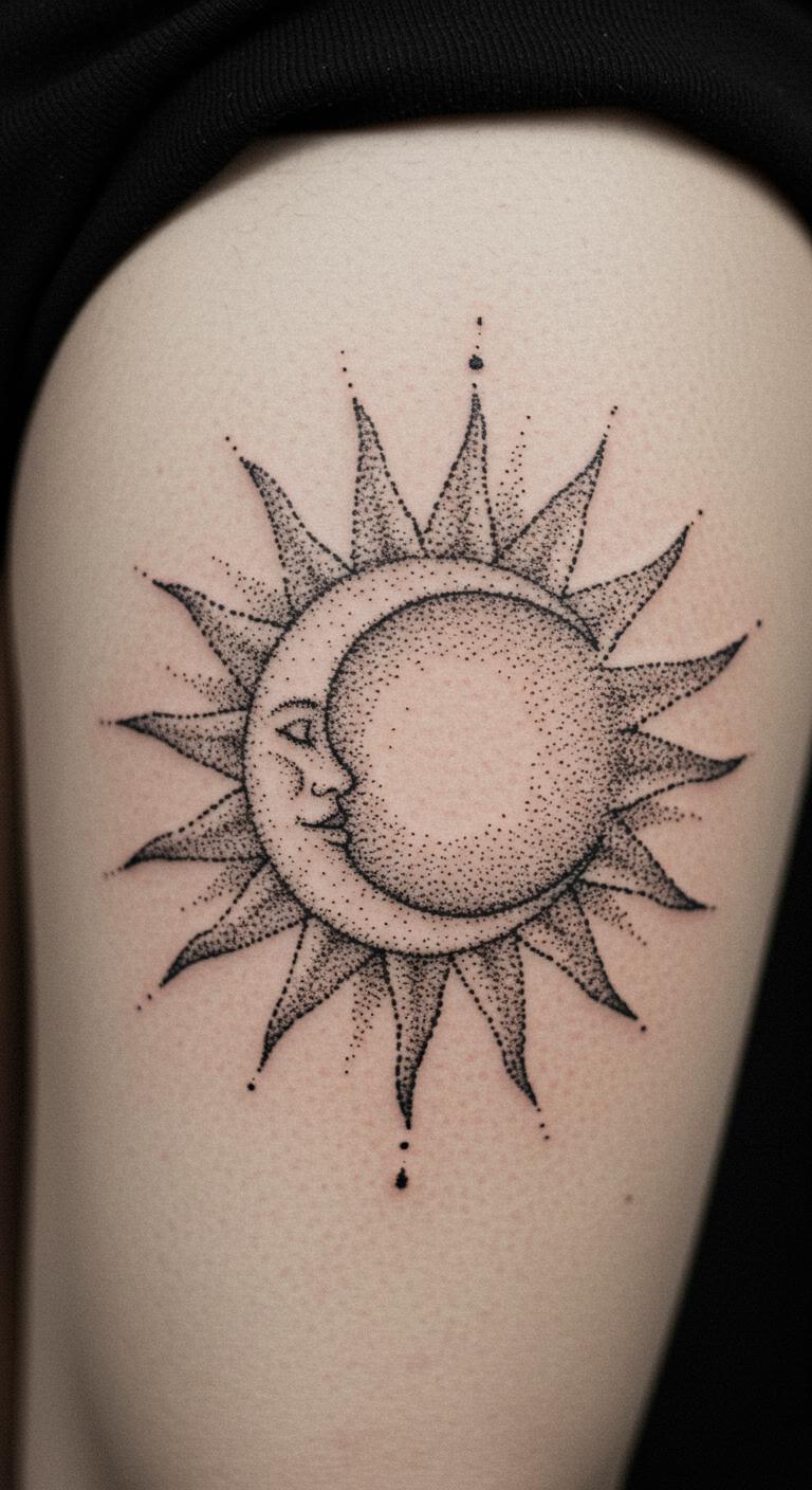 Build depth with dots for your sun and moon. Choose your thigh for a larger canvas. Dot patterns create a textured look. Practice dotting on paper with a fine pen. Layer dots gradually at your desk. Search for dotwork pros at affordable parlors. Care with items in your medicine cabinet. Bold the step: dot on paper first. It refines your idea simply.