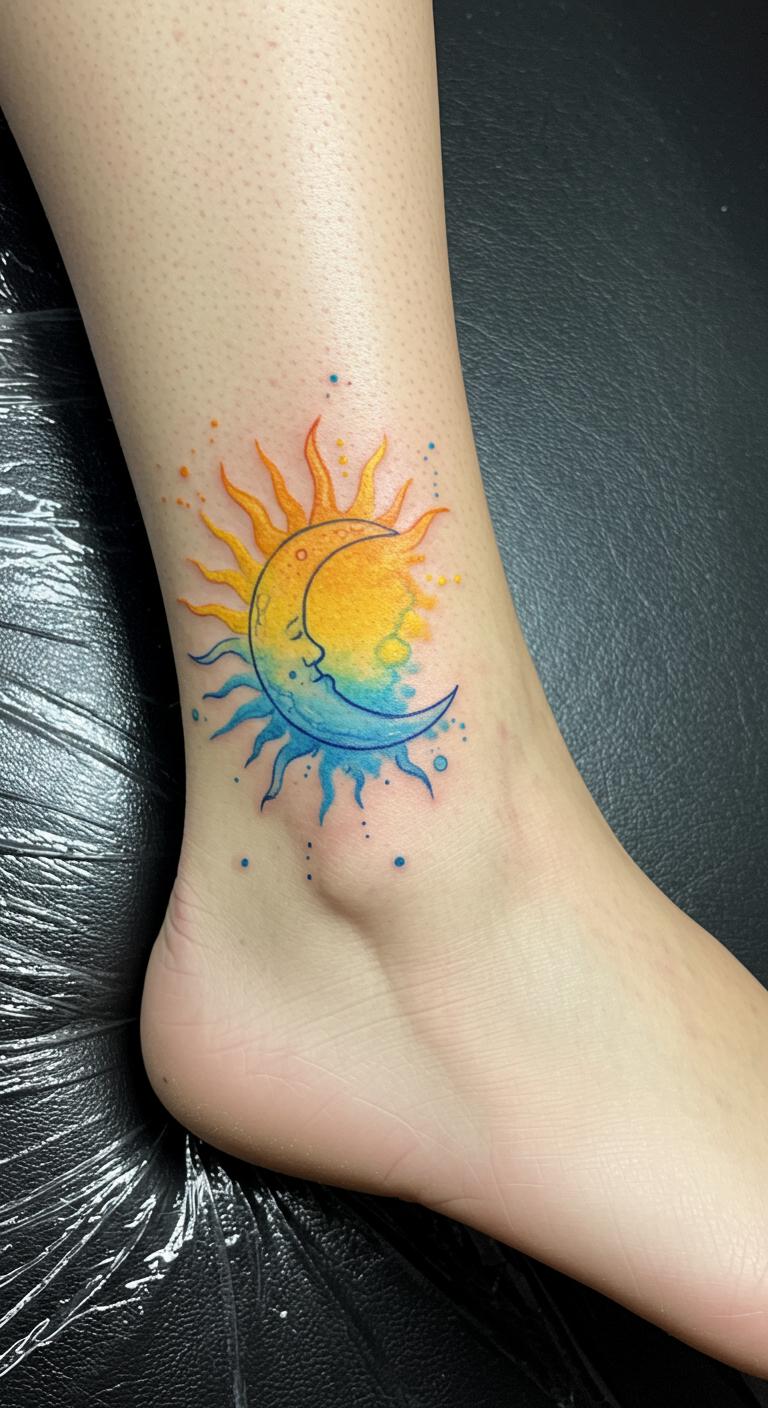 Bring color to life with a watercolor style for your sun and moon. Place it on your ankle for a playful touch. Blend soft shades like yellow for sun and blue for moon. Experiment at home with watercolors on paper to match your vision. Use household brushes for quick tests. Find artists who do watercolor at community events; prices are often lower. Care for it with simple bandages you already own. Bold the idea: test colors on paper. This keeps costs down and ideas fresh.