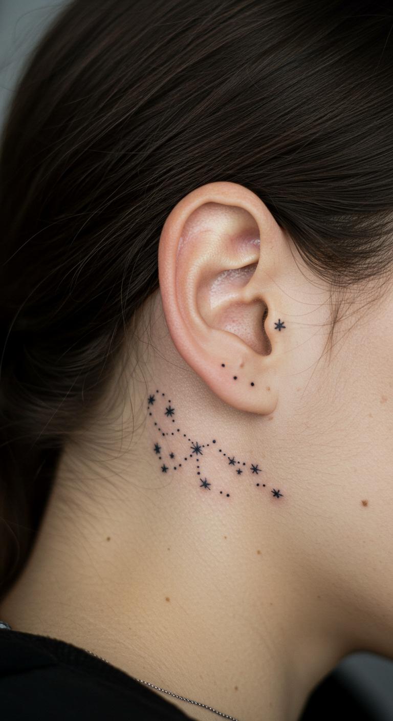 An ear tattoo with the Taurus constellation offers a discreet nod to your sign. Imagine tiny dots connected by lines that form stars. It fits perfectly in a hidden spot. Draw the constellation on a mirror with eyeliner to plan it out. Free apps can help you trace it accurately. Look for artists charging less than $150 for small pieces. This design mixes astrology with simplicity. Add a single star for extra flair if you like. The process is quick and painless in that area. Use a temporary tattoo kit from the drugstore to preview it. No high costs involved. This idea keeps your style timeless and personal.