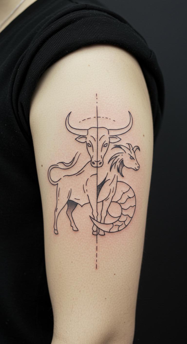 Fuse a bull with a Capricorn goat on your bicep for unity. Lines connect the two smoothly. Sketch both animals overlapping on paper. Free resources abound. Artists charge $140 for fusions. Add a shared element like horns. This spot shows strength. Use collage paper to plan at home. Under $10. The tattoo represents bonds beautifully.