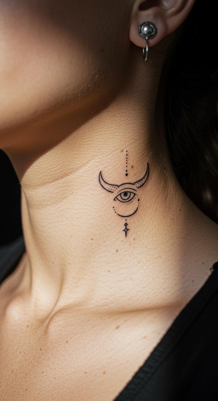 A single Taurus eye on your neck adds mystery. Just an outline of the eye. Draw eyes on a mirror for practice. No money needed. Neck tattoos cost about $70. Customize with a lash. This placement is edgy. Try eye stickers first. Cheap and quick. The design watches over you.