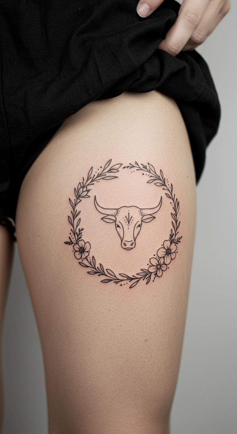 A floral wreath around a bull on your thigh frames Taurus nicely. Flowers loop around for charm. Sketch wreaths and bulls on paper. Easy and free. Thigh artists go for $100. Pick specific flowers. This area hides under clothes. Use yarn to wrap a mock-up. Budget-friendly fun. The tattoo blooms with personality.