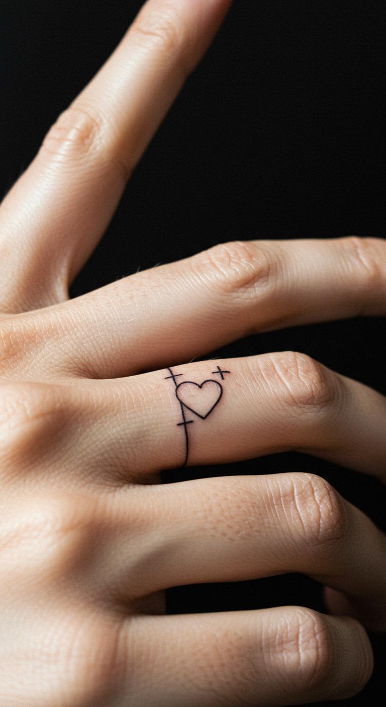 A Venus heart on your finger symbolizes love simply. A heart with a cross line. Draw hearts on your finger with pen. Free start. Finger artists charge $40. Make it smaller. This design is discreet. Try ring stickers first. Affordable option. It beats with meaning.