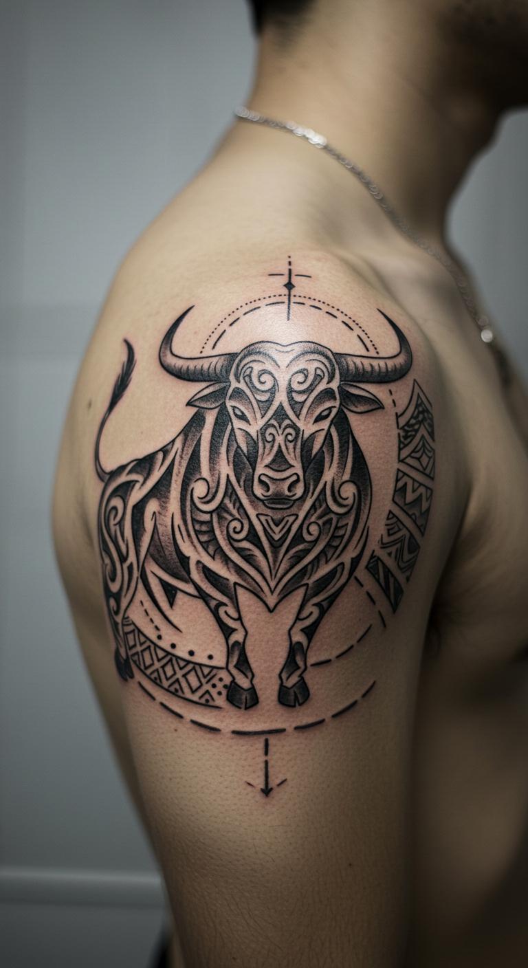 Reimagine a tribal bull on your shoulder blade with geometric patterns. Lines form a new twist. Draw tribal designs on paper. Free activity. Shoulder artists go for $130. Customize patterns. This spot is strong. Use stamps to preview. Under $10. The tattoo merges styles smartly.