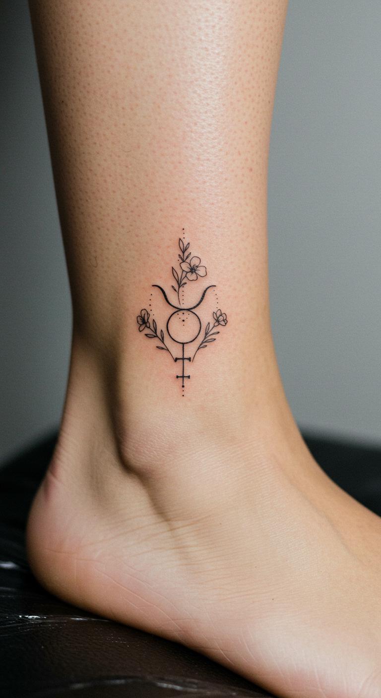 A Venus symbol paired with flowers on your ankle brings Taurus grace to life. Think of a circle with a cross and a few petal outlines around it. This combo highlights love and nature. Sketch it on your skin with a washable marker first. It helps you visualize without spending a dime. Find affordable artists online for under $200. Make it your own by adding a favorite flower shape. The design stays simple and elegant. Apply a henna version at home using kits under $10. No complex steps needed. This tattoo works for any outfit and age. Focus on clean lines for that lasting appeal.