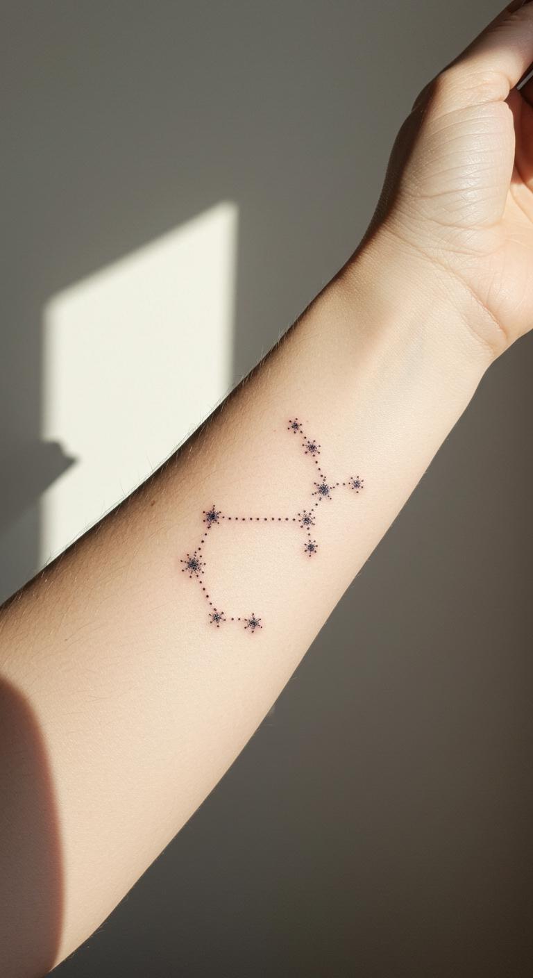 Dots for the Taurus constellation on your arm create a map. Connect them lightly. Dot paper patterns at home. Free start. Arm artists at $100. Add more dots. This placement is visible. Use dot stickers to plan. Budget-friendly. The design stars you.